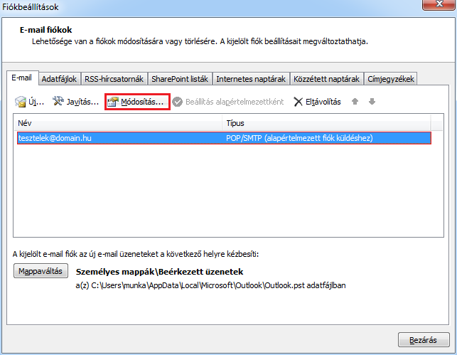 A fiók listából válassza ki a módosítani kívánt postafiókot. Majd kattintson a Módosítás gombra.