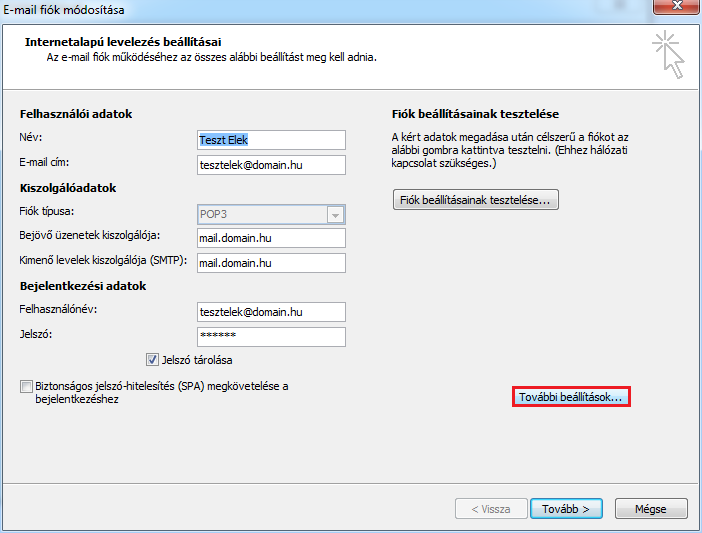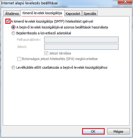 A Kimenő levelek kiszolgálója fülön pipálja be „A kimenő levelek kiszolgálója (SMTP)” hitelesítést igényel-t.